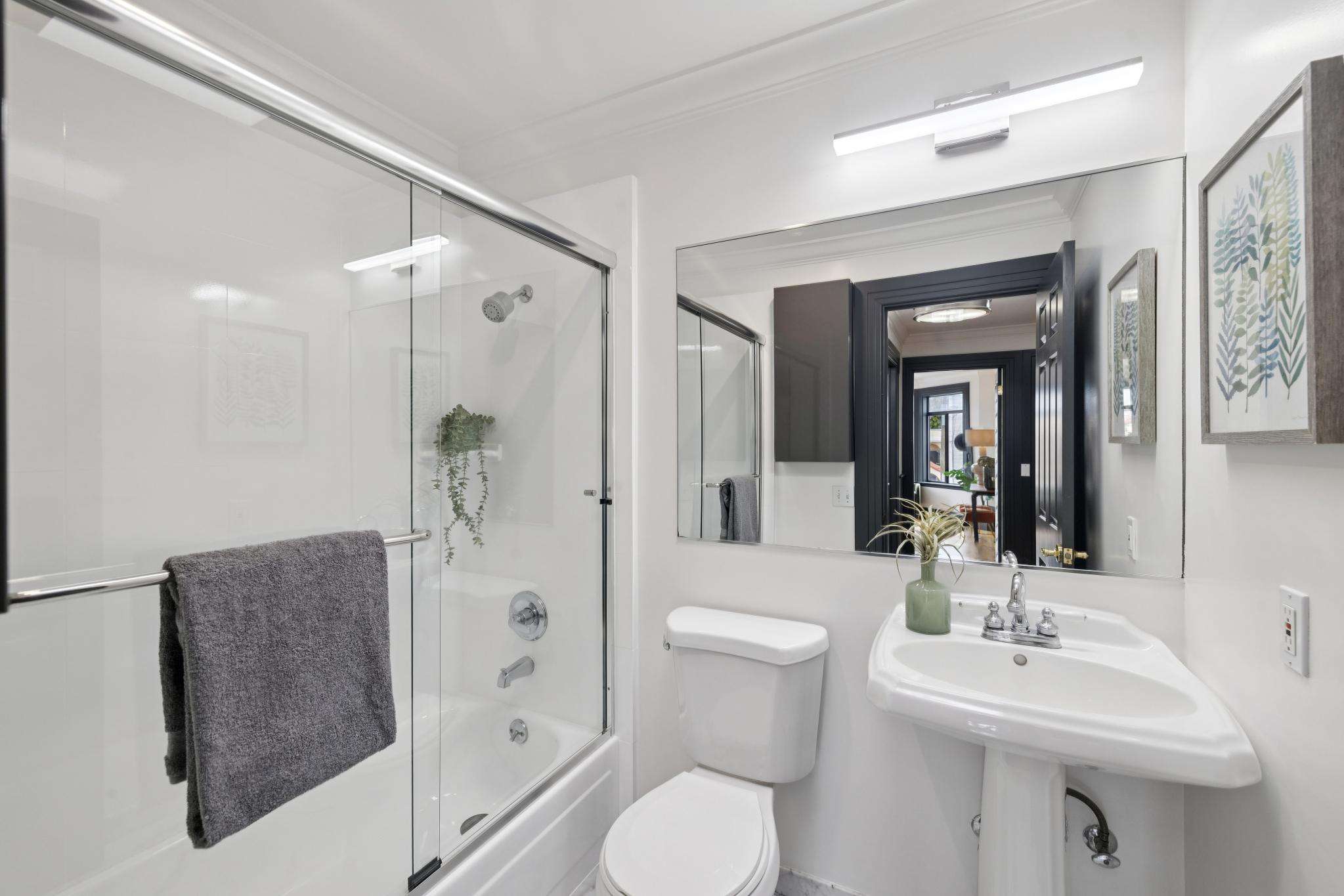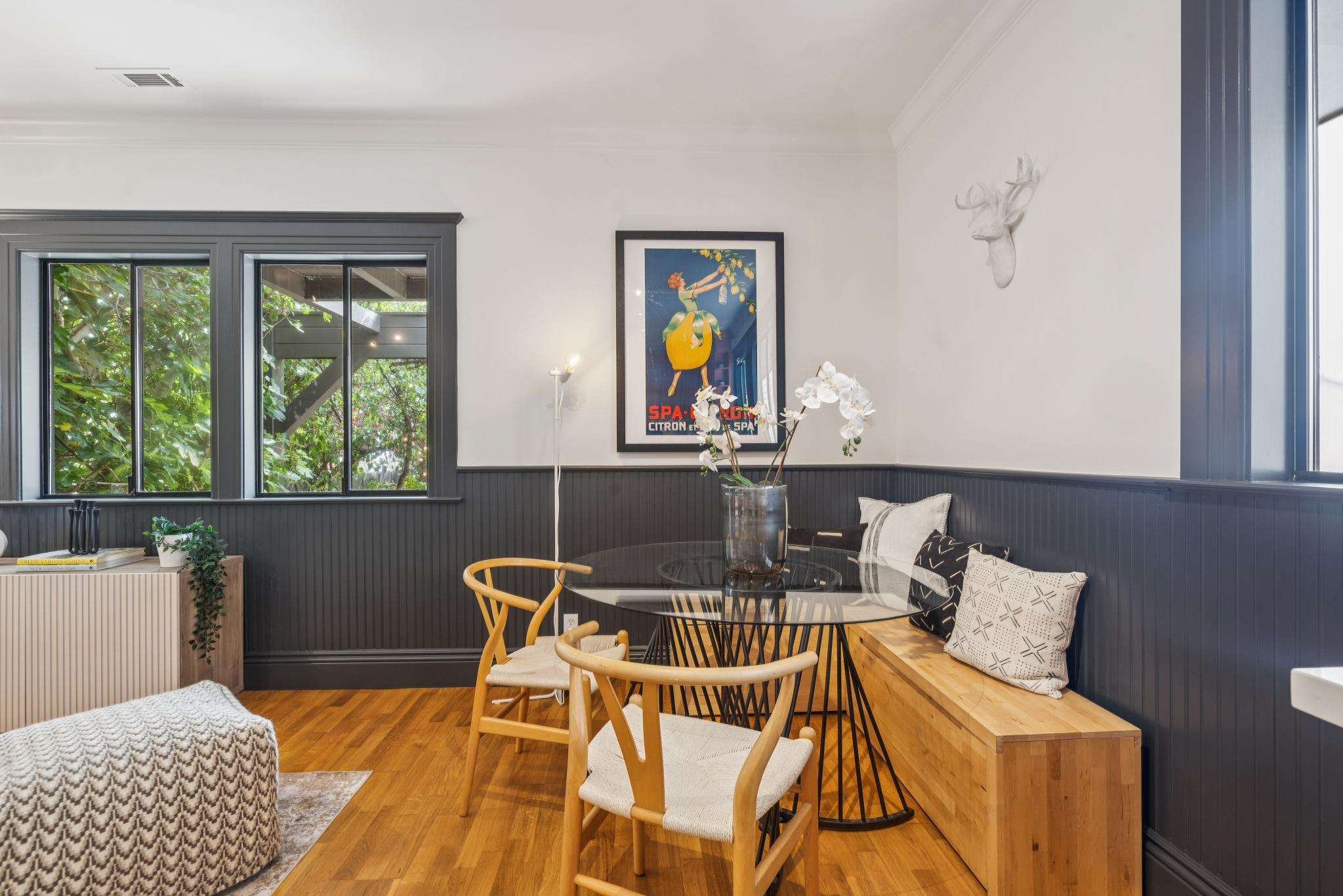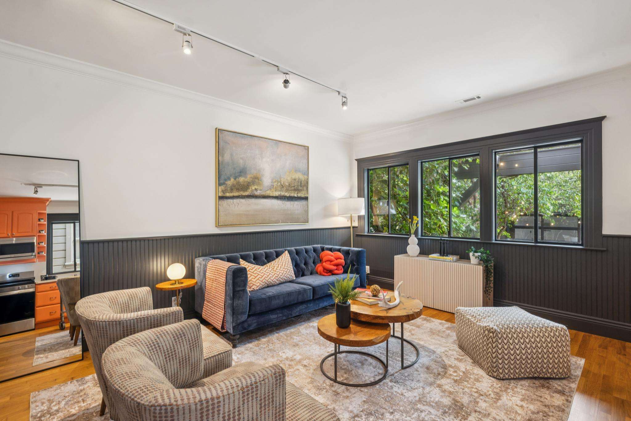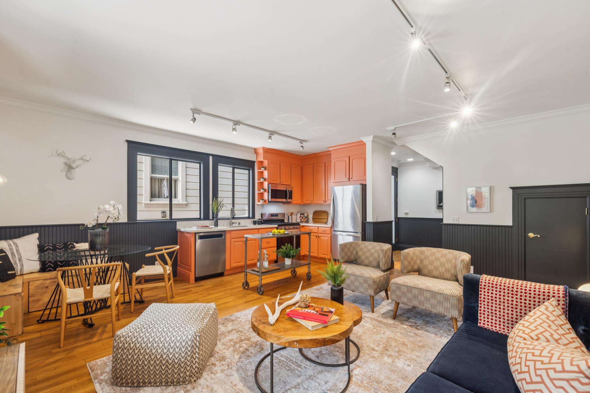 Inside, expansive living and dining rooms flow into open kitchens made for gathering. Sunlight pours through oversized picture windows and skylights, dancing across hardwood floors and illuminating every detail. Convenience comes standard with powder rooms and in-unit laundry on the main level, while upstairs bedrooms are paired with beautifully updated baths. In the back unit, a serene bedroom opens onto a private deck—your sanctuary for morning coffee or sunset unwinding.